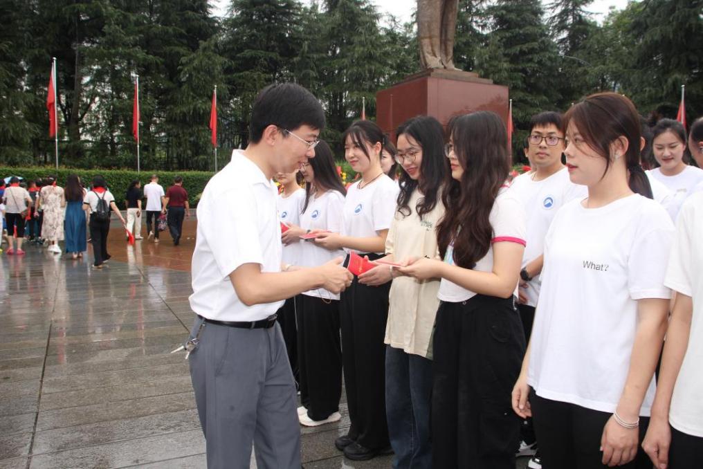 接着,开展入党宣誓。奏唱国歌后,由刘正妙、刘图其为新发展党员发放《中国共产党章程》、老党员为新发展党员佩戴党徽。之后,由刘正妙领誓,全体党员举起右手,面向党旗郑重宣誓。李姝琪作为新展党员代表发言,她讲道:“我们将铭记自己向党和人民许下的郑重承诺,把入党誓词作为自己终身的修养、追求和实践”。最后,刘正妙发表讲话并对新发展党员提出三点要求和期望:一是加强学习,做一个真正的马克思主义者;二是践行服务宗旨,做一名扎根人民的勤务兵;三是发挥模范作用,做一面闪光的先锋旗帜。