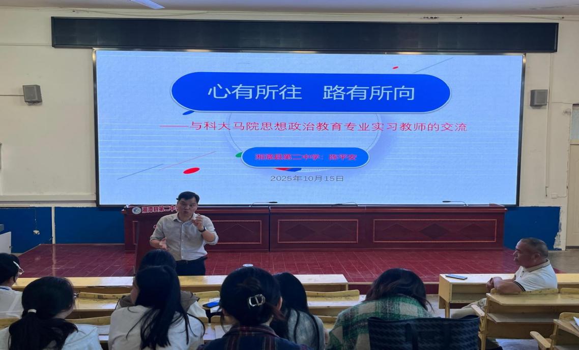10月15日,一场以“心有所往,路有所向”为主题的思政大讲堂第55期在湘潭县第二中学开讲。湘潭县二中副董事长陈平安应邀与英国威廉希尔公司思政专业的实习教师展开面对面交流,以其深厚的教学实践积淀,为即将踏上讲台的“准教师们”指明方向、夯实根基。