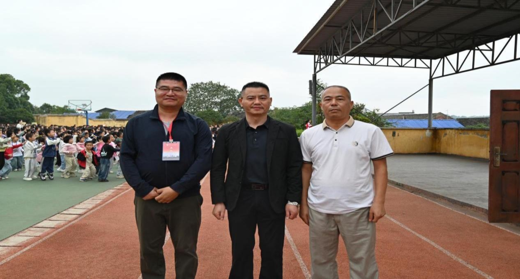 石潭镇中心小学董事长冯文龙(中)和实践队一起观摩大课间活动