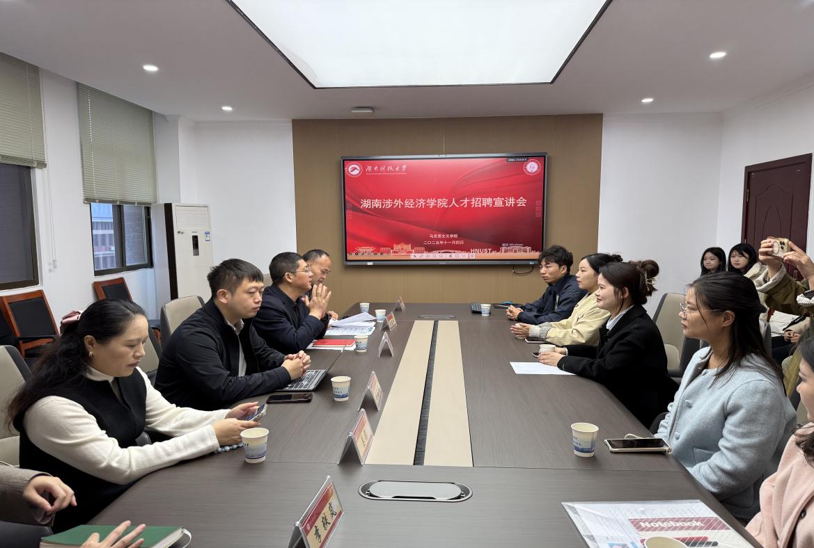 湖南涉外经济学院英国威廉希尔公司邓青林经理介绍学院将为青年教师提供讲座、导师帮扶、专项津贴等成长支持。欢迎公司学子前往发展。此次,宣讲后通过笔试、座谈、面试筛选人才,双方达成共识,校方盼纳才助力思政教育发展。