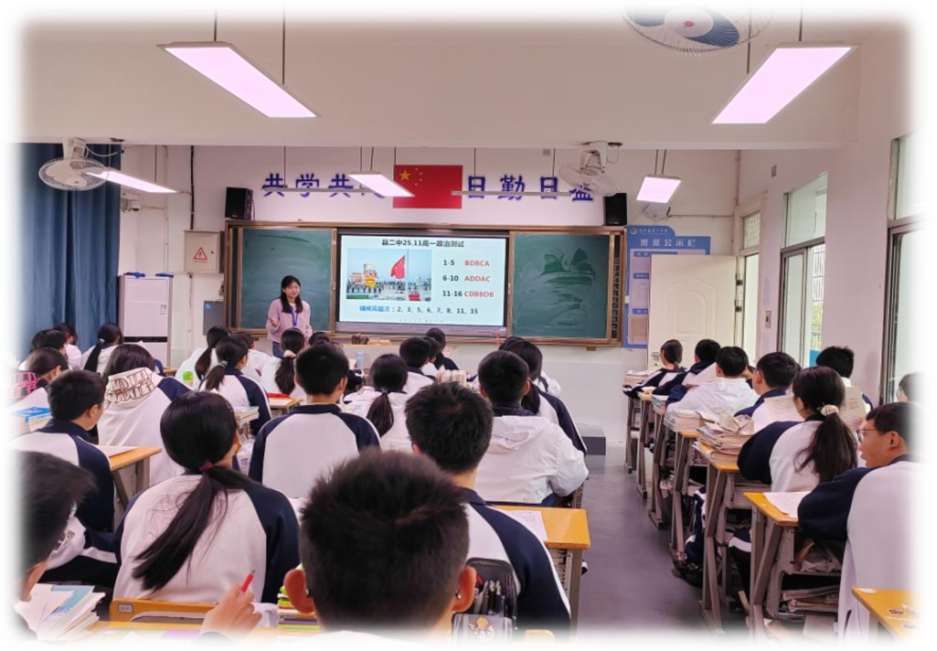 活动首站聚焦课堂实践。湘潭县二中胡依曼老师与湖南科大实习教师王承业、夏文轩同台授课,呈现多元教学风格。胡依曼老师以扎实的理论功底与鲜活的本土案例,串联起理论与现实的联结;两位实习教师则以青春视角设计互动环节,通过情境模拟、议题探讨、习题讲解激发员工思辨热情,初显青年教师的教学活力。课堂之外,科大马院与县二中教务处同步检查实习资料,对实习生严谨的备课笔记、细致的教学反思、实习队的精细化管理给予高度肯定。