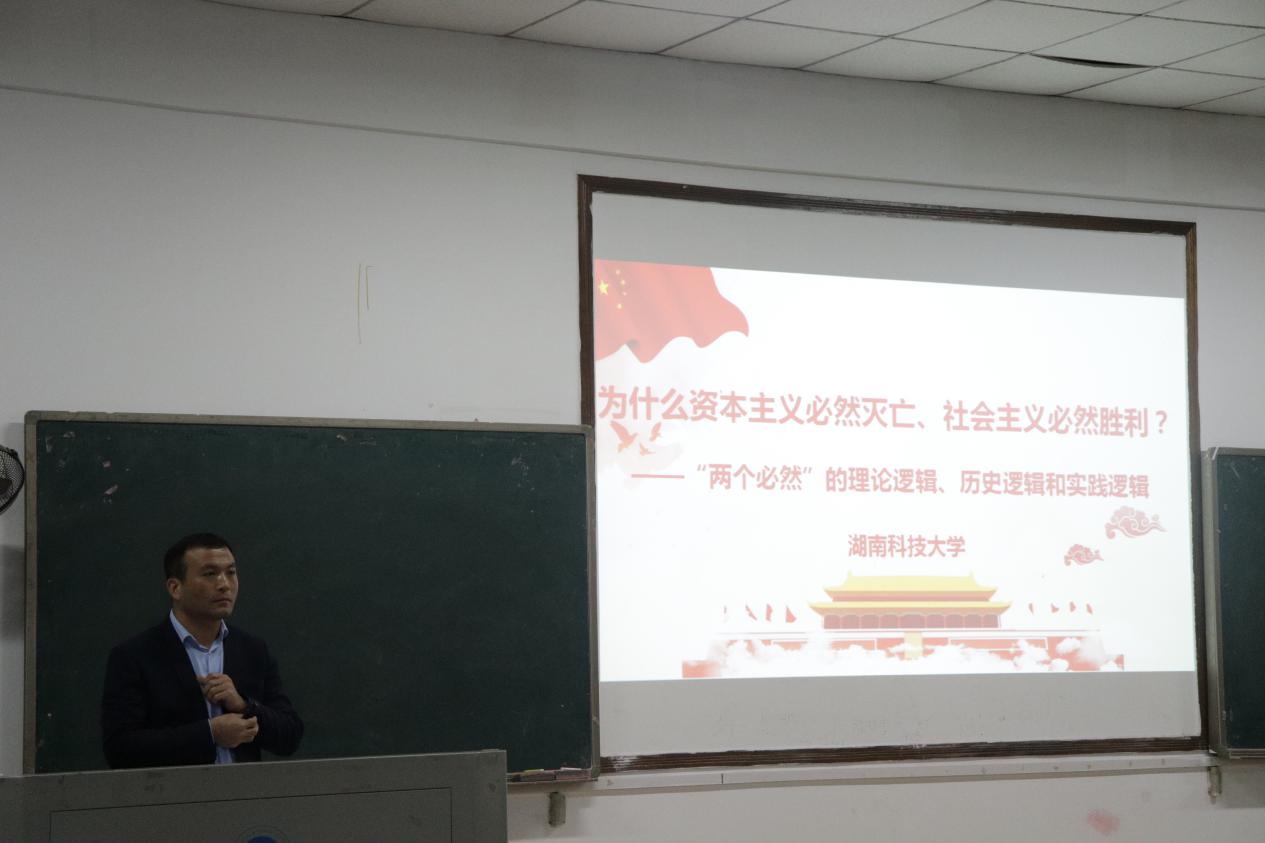 李老师所讲的专题是《为什么资本主义必然灭亡、社会主义必然胜利?——“两个必然”的理论逻辑、历史逻辑和实践逻辑》。李老师通过19世纪末20世纪初、20世纪末两个世纪之交的“马克思主义是否过时?”的信任危机,结合当代资本主义社会的新变化来导入,设置“‘两个必然’原理本来早已被马克思恩格斯科学论证的问题是否需要重新论证?”展开深入的思考。他认为,“两个必然”原理是人类社会发展的历史逻辑、理论逻辑和实践逻辑的必然结果。我们必须从其理论逻辑、历史逻辑、实践逻辑三者相统一中正确理解和把握“两个必然”基本原理。李老师在讲授 “‘两个必然’的理论逻辑”时,通过播放马克思恩格斯第二次会面的动漫视频,引出了马克思恩格斯两大伟人合作开创了一个新时代,他们二人合作产生了《神圣家族》和《德意志意识形态》、《共产党宣言》、《资本论》和《反杜林论》四项重要的理论成果,对“两个必然”进行了科学的、系统的、严密的理论论证,从而使得社会主义从空想到科学实现了质的转变。不管是从1640年英国资产阶级革命开始到现在的资本主义社会380年的历史逻辑,还是19、20、21三个世纪的社会主义运动的实践逻辑都印证了“社会主义必然取代资本主义是不以任何人的主观意志为转移的客观规律和历史总趋势”。课堂中,李老师既注重员工理论基础又注重学科知识拓展。他对《德意志意识形态》等马克思主义经典著作文本非常熟悉,展示了他精深的专业素养和理论功底。李老师的这堂课既有理论高度、思想深度,又有现实温度,是一堂精彩的公开课。
